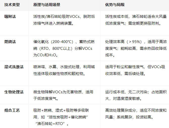 根据废气浓度、风量、成分选择工艺(如高浓度用燃烧法,低浓度用吸附法)。