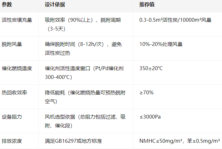 催化燃烧参数:催化剂(贵金属Pt/Pd,寿命≥8000h),预热温度200-250℃,脱附风量10%-20%处理风量。