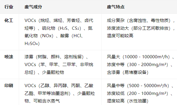 化工、喷涂、印刷行业的废气成分、风量、浓度差异显著,需针对性处理: