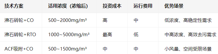 浓缩选择:大风量、低浓度场景选沸石转轮(寿命长、稳定性高),小风量可选ACF(体积小);