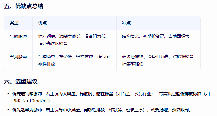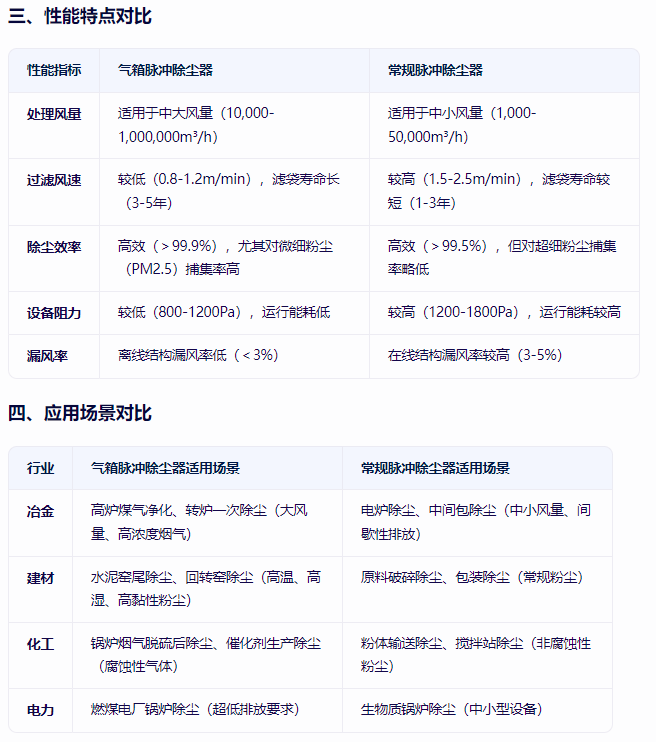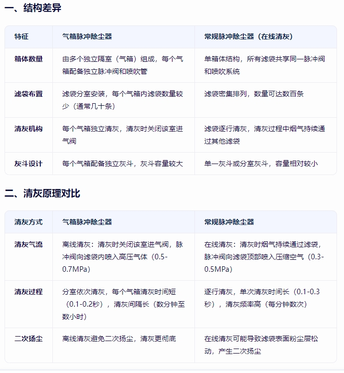 气箱脉冲除尘器和常规脉冲除尘器(通常指在线清灰脉冲除尘器)在结构、清灰原理、性能特点及应用场景等方面存在显著差异,以下是具体对比: