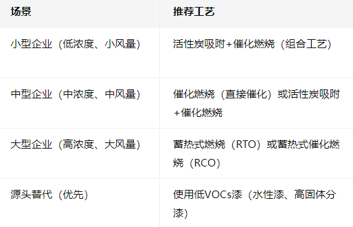 根据废气中VOCs浓度(低/中/高)、风量、成分,选择合适技术: