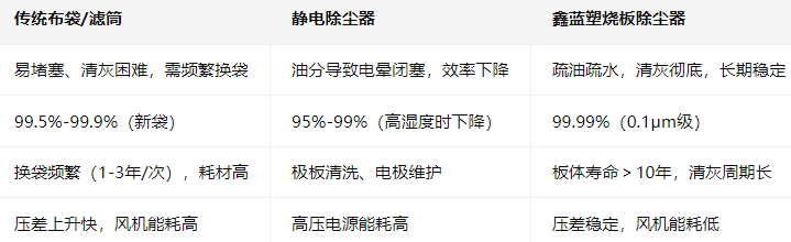凯发一触即发环保的塑烧板除尘器在含油含水粉尘治理中,相比传统方案(布袋、滤筒、静电)优势显著:
