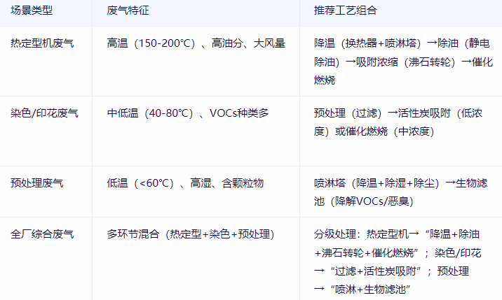 印染企业需根据废气来源、浓度、风量匹配工艺,典型场景如下: