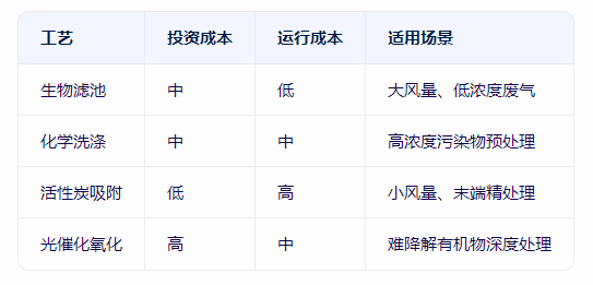 化学洗涤(除H?S/NH?)→生物滤池(除VOCs)→活性炭吸附(应急保障)。