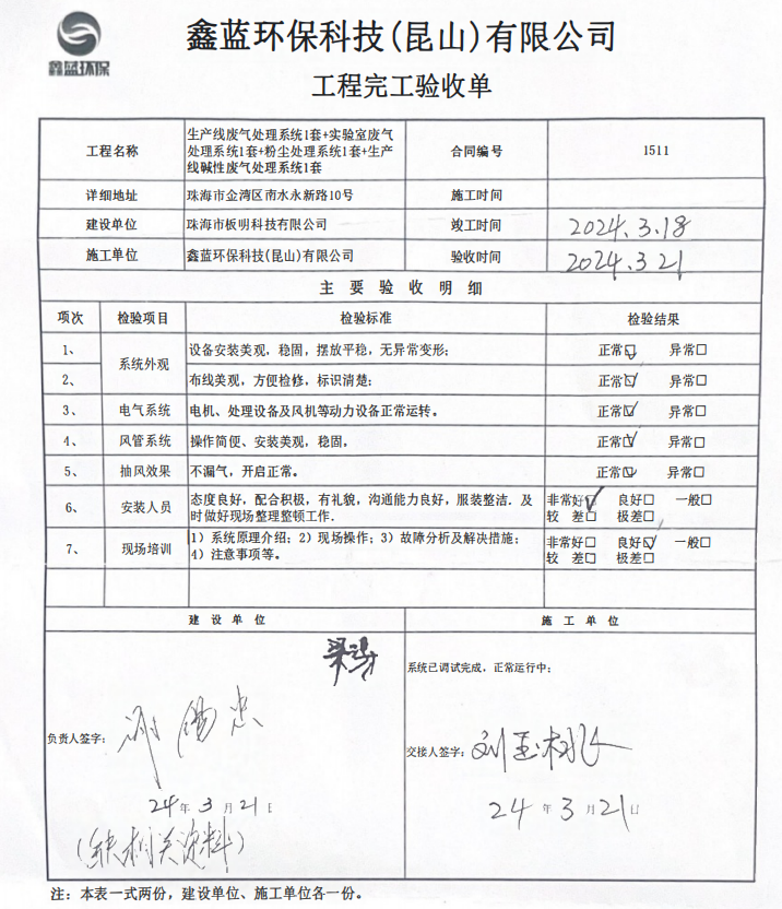珠海市板明科技有限公司废气项目竣工验收-凯发一触即发环保