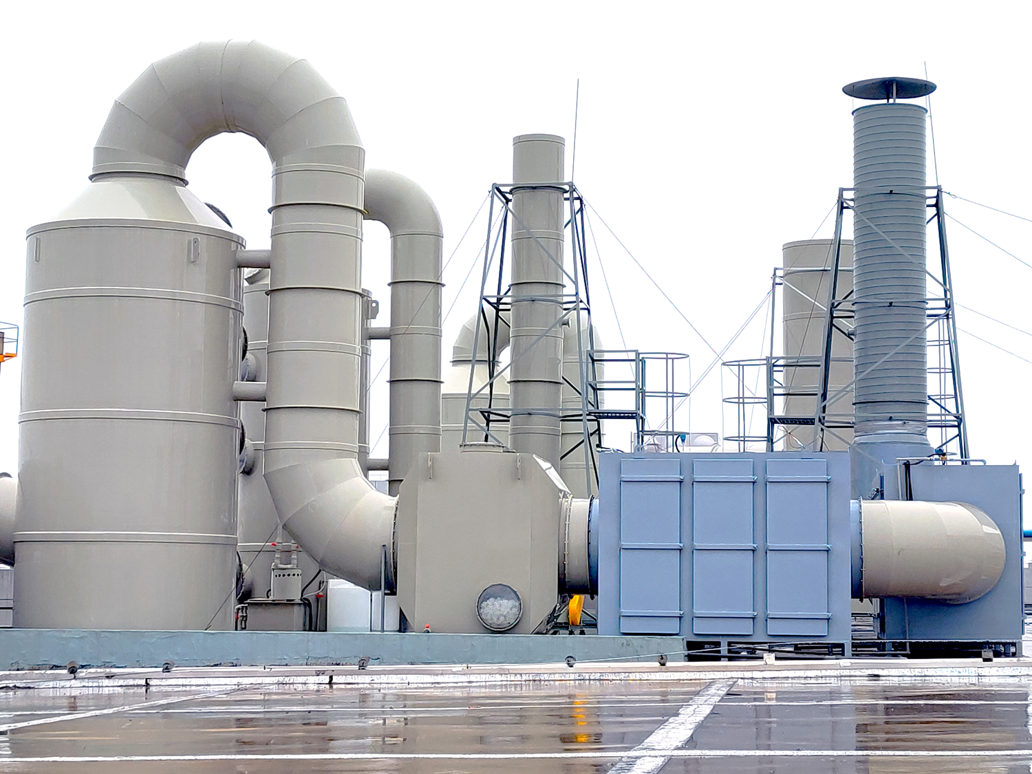 原理:在洗涤塔中,废气与化学药剂(如NaOH、NaClO、H?SO?等)发生酸碱中和或氧化还原反应,从而被去除。